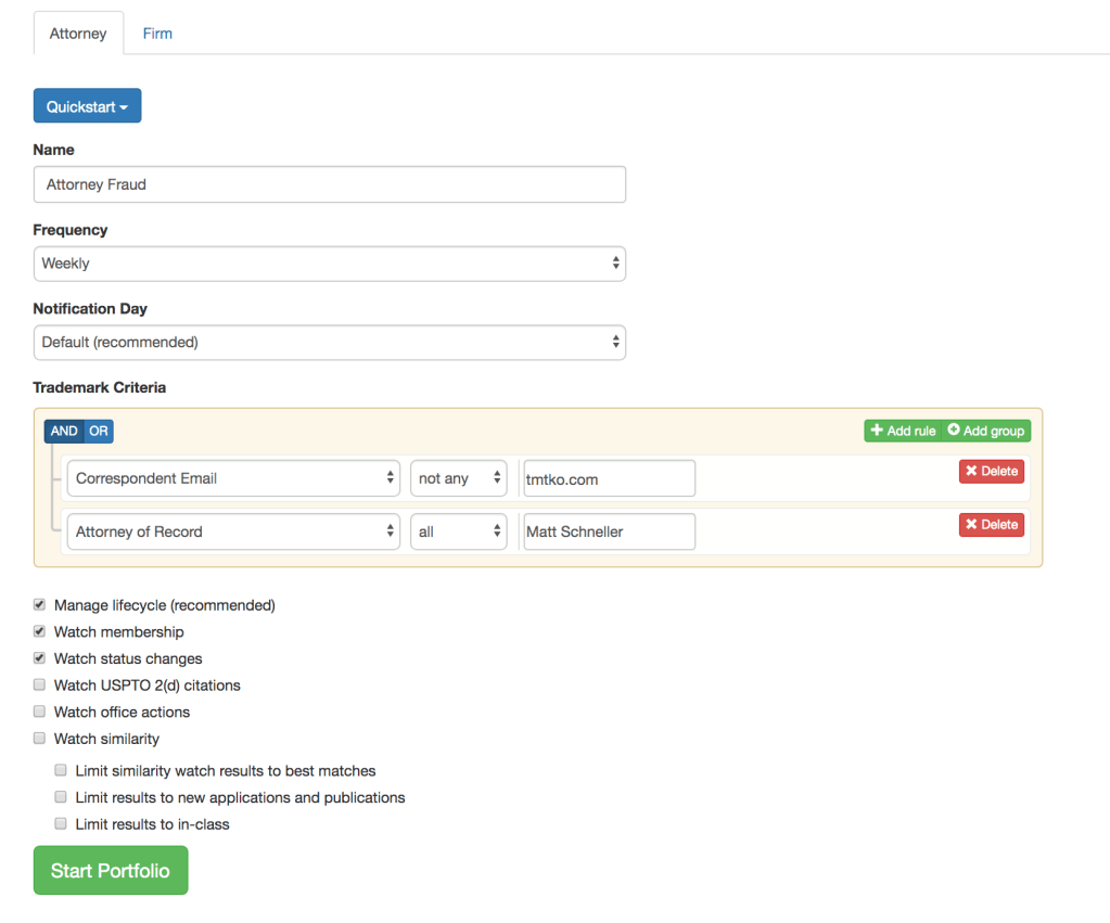 Click on Portfolios then New Portfolios, and stay in the “Attorney” tab. Give this Portfolio a name, like “Attorney Fraud.” If you are a one-person practice or only checking yourself, add two rules: one for your name as Attorney of Record, and one for the Correspondent Email. Leave only the top three checkboxes selected, as shown below.