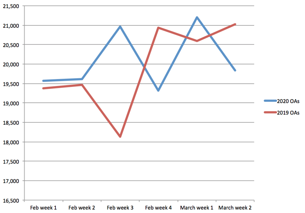 So, has there been any immediate impact from the COVID-19 quarantines? Surprisingly, yes – the trademark examination branch’s pace of issuing Office Actions was basically identical in February and the first week of March. The second week of March, which just concluded, held up pretty well – the Office was right around the normal production for a week in either 2019 or 2020, pre-virus. Numbers were down a bit from the prior week, but within the normal variance range.