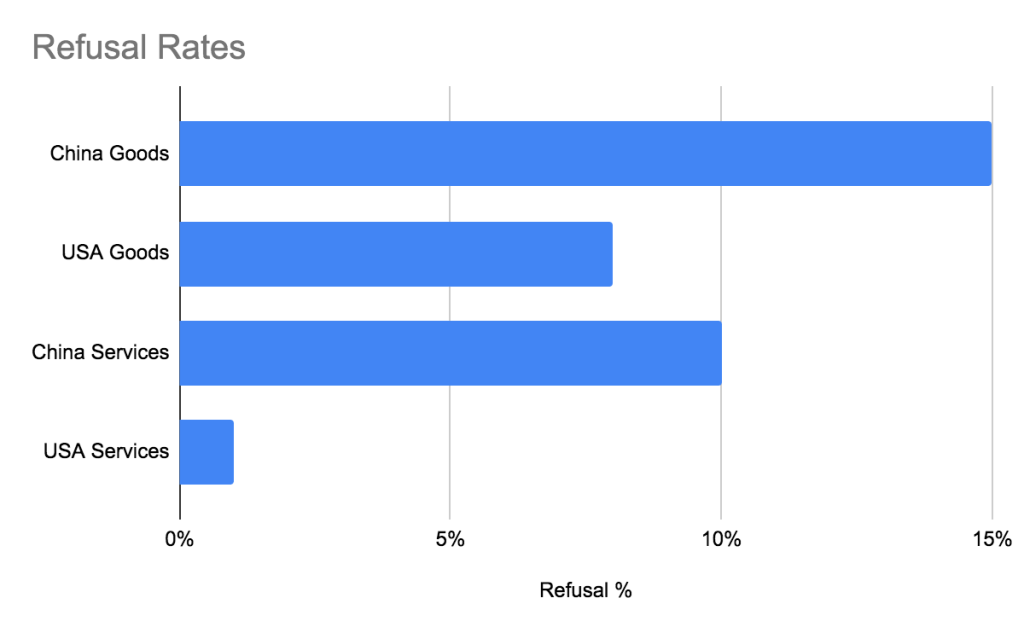 Overall, currently or formerly use-based applications in the goods classes are getting a ton more “digitally altered” specimen refusals than specimen-class applications. That makes sense; most service-class specimens are websites anyway, and it’s just as easy to put up a crummy real website that will pass examination muster as it is to mock up a crummy fake website. Refusals of US applications with Chinese applicants were about twice as high as the rate of refusals of applications owned by US-based applicants for goods-based applications (15% vs. 8%) and about 10 times as high for services-based applications (10% vs. 1%). Because use-based applications in the goods classes from Chinese-based applicants actually outnumber such applications from US-based applicants since July 2019, when the USPTO announced this new prosecution focus, this means that almost twice as many these “digitally altered” refusals (by raw number counts) have gone out on applications where the applicant is based in China than to applications where the applicant is based in the US.