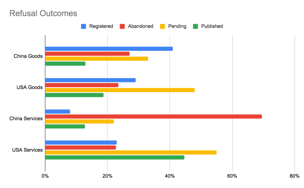 So, what happens once these refusals are issued? A pretty good percentage of the applications that get those refusals are still pending – about 40% of applications from China-based applicants, and about 50% applications from US-based applicants. Of the rest, more applications are “fixing” the issue and getting through to registration, including a slightly higher percentage for China-based applicants overall (though very few of the smaller service-class dataset) than for US-based applicants.