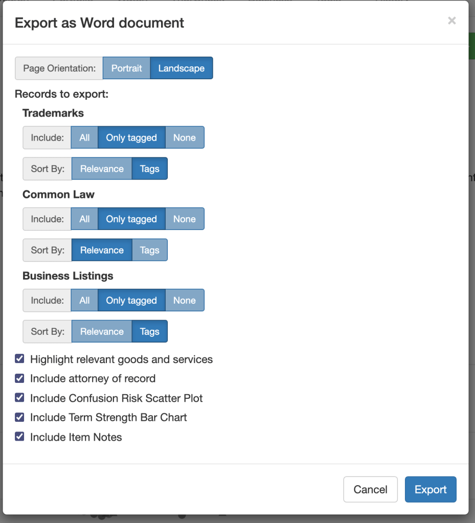 When you click on an export type, you’ll get a much more detailed set of options than before. You now have more optionality about both what results to include by section (all, only tagged, or none) and about the order they will appear (sorting by relevance or tags). If you sort by tags, you’ll get results in order, with red first then yellow, green, blue, and clear (untagged). This should allow you to get your charts ordered exactly how you want them with less effort.
