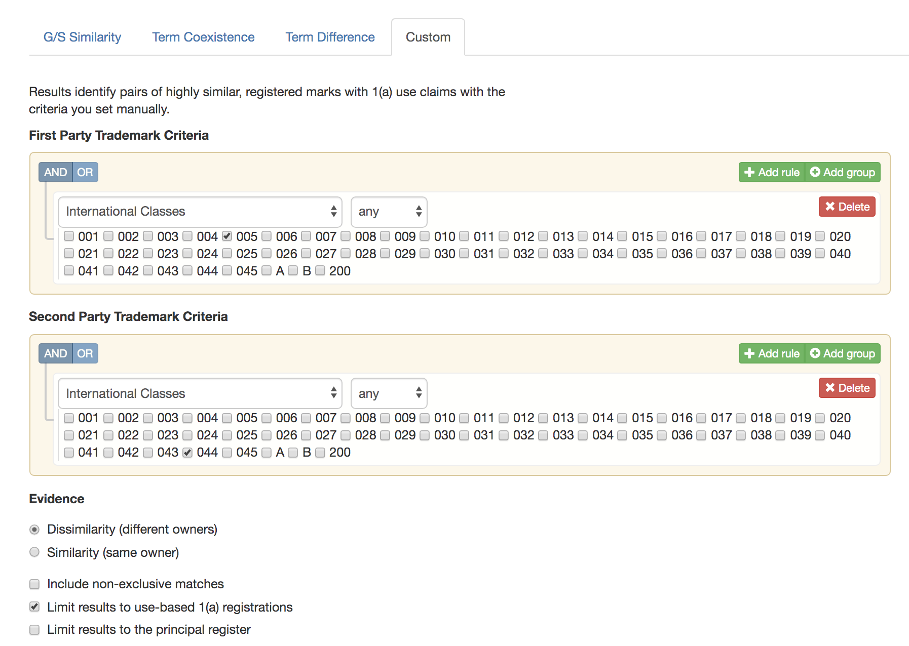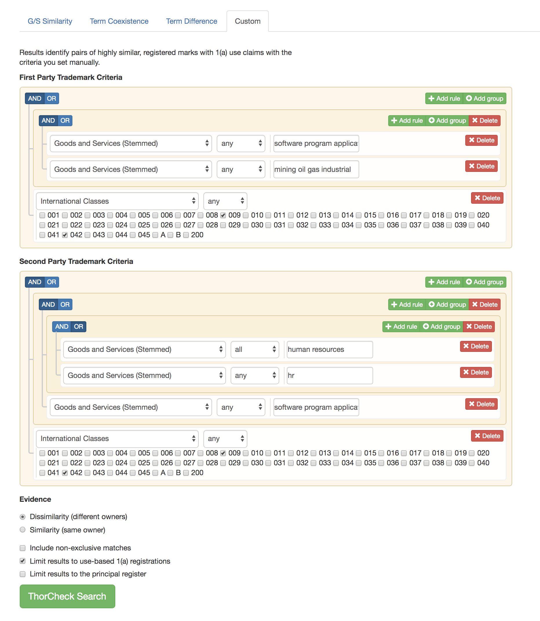 Custom goods and services ThorCheck search strategies look a little more complicated, but they are conceptually simple: come up with two sets of search strategies that identify either different (Dissimilarity option) or overlapping (Similarity option) universes of marks. ThorCheck will put all the pieces together, lining up identical marks with either different owners (Dissimilarity option) or identical owners (Similarity option).
