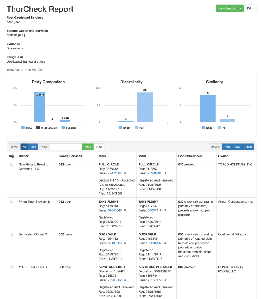 The table below the graphical analysis section contains all the comparative research examples that you’ve come to expect. In the screenshot below, you’ll see the first three marks are identical, matching the “3” as “Exact” in the “Dissimilarity” section, and then the similar-but-not-identical mark comparisons start, like KEYSTONE LIGHT (disclaiming “light”) vs KEYSTONE PRETZELS (disclaiming “pretzels”). These are the examples that you will use to support your arguments, and the evidence you will provide your Examiner or the Board.